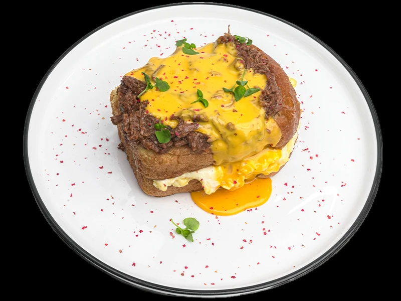 Бриошь, рваная говядина, сливочный соус, соус bbq, яйцо, сыр чеддер.