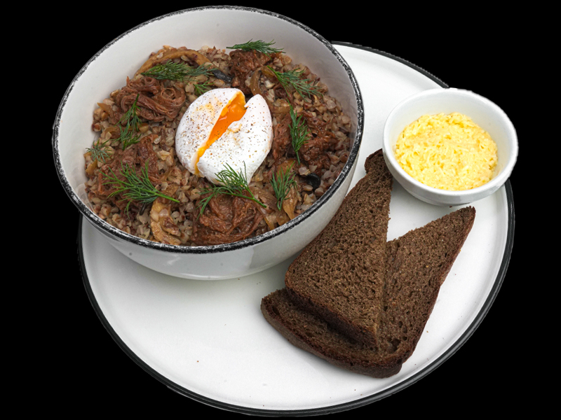 Гречневая крупа, вешенки, лук, яйцо пашот, рваная говядина, соус bbq, укроп, хлеб бородинский, намазка с сыром и чесноком.